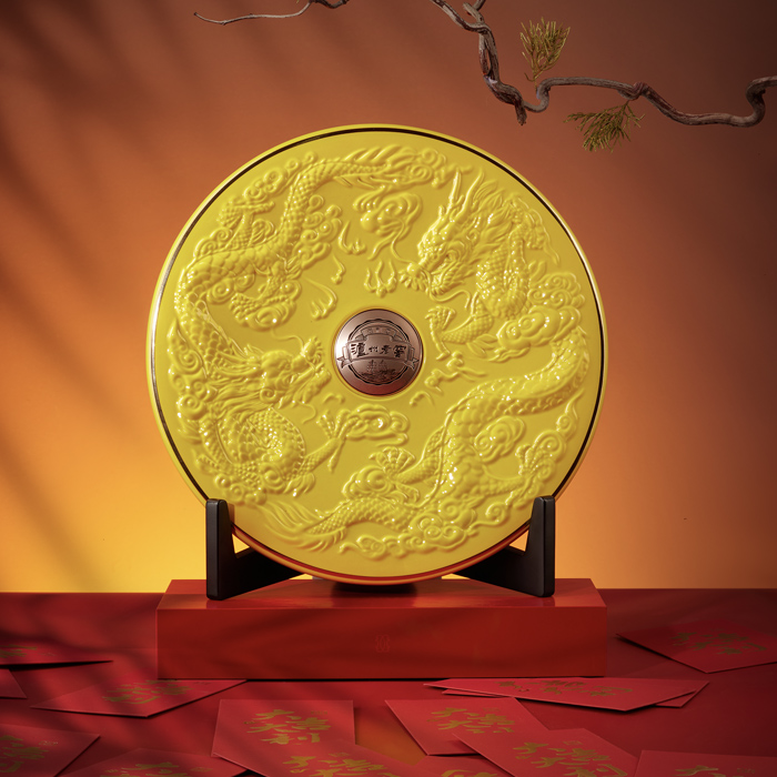 采用了国瓷永丰源烧制的帝王黄色釉瓶体,古典礼盘形状,雅致端庄,饱含龙年“家国双隆,腾飞有时”的圆满心意。