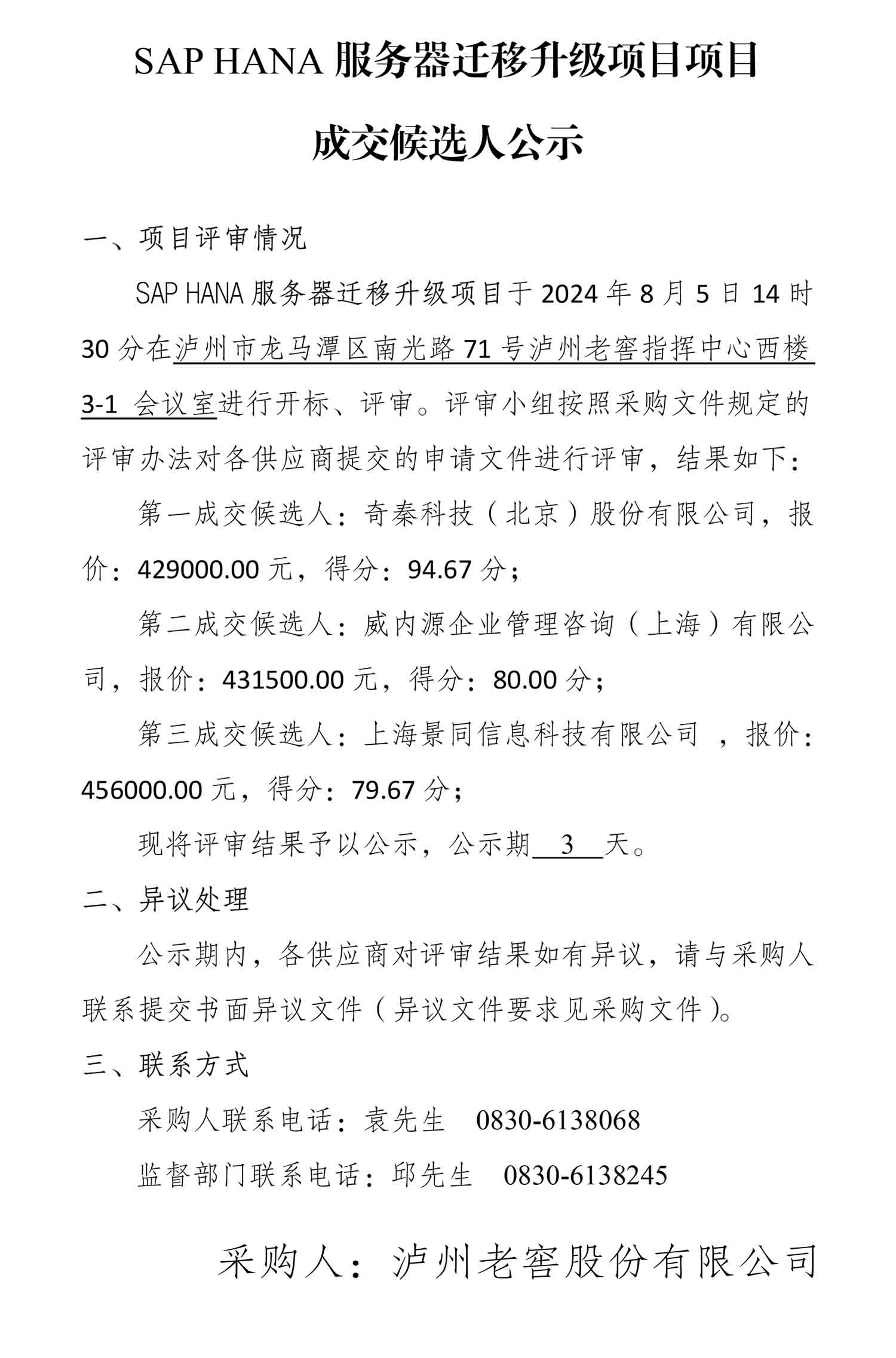 SAP HANA服务器迁移升级项目成交候选人公示