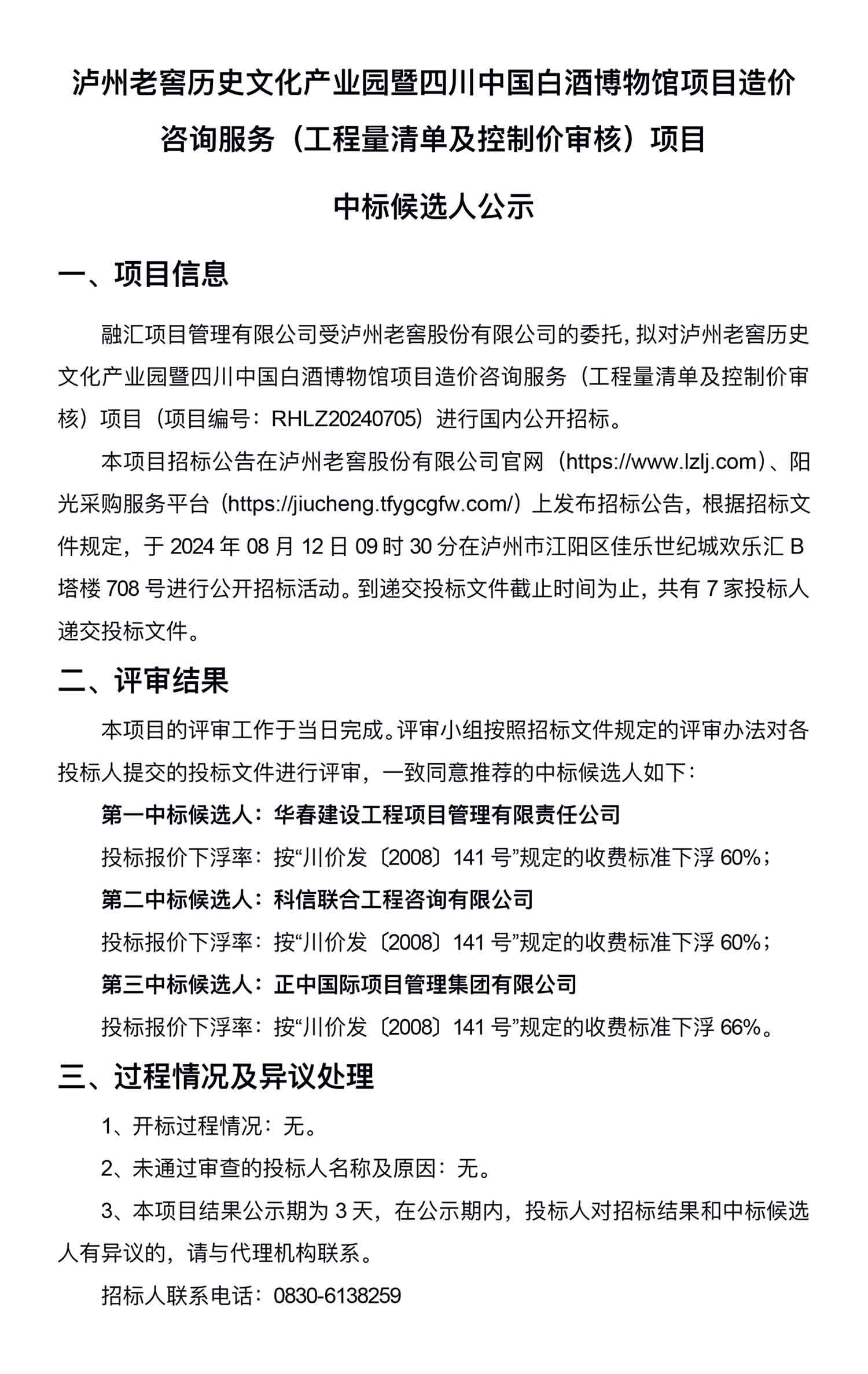 老司机 历史文化产业园暨四川中国白酒博物馆项目造价咨询服务(工程量清单及控制价审核)项目中标候选人公示