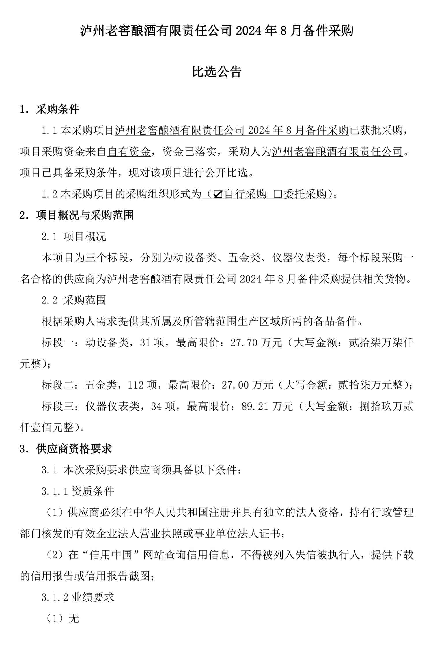 老司机 酿酒有限责任公司2024年8月备件采购比选公告