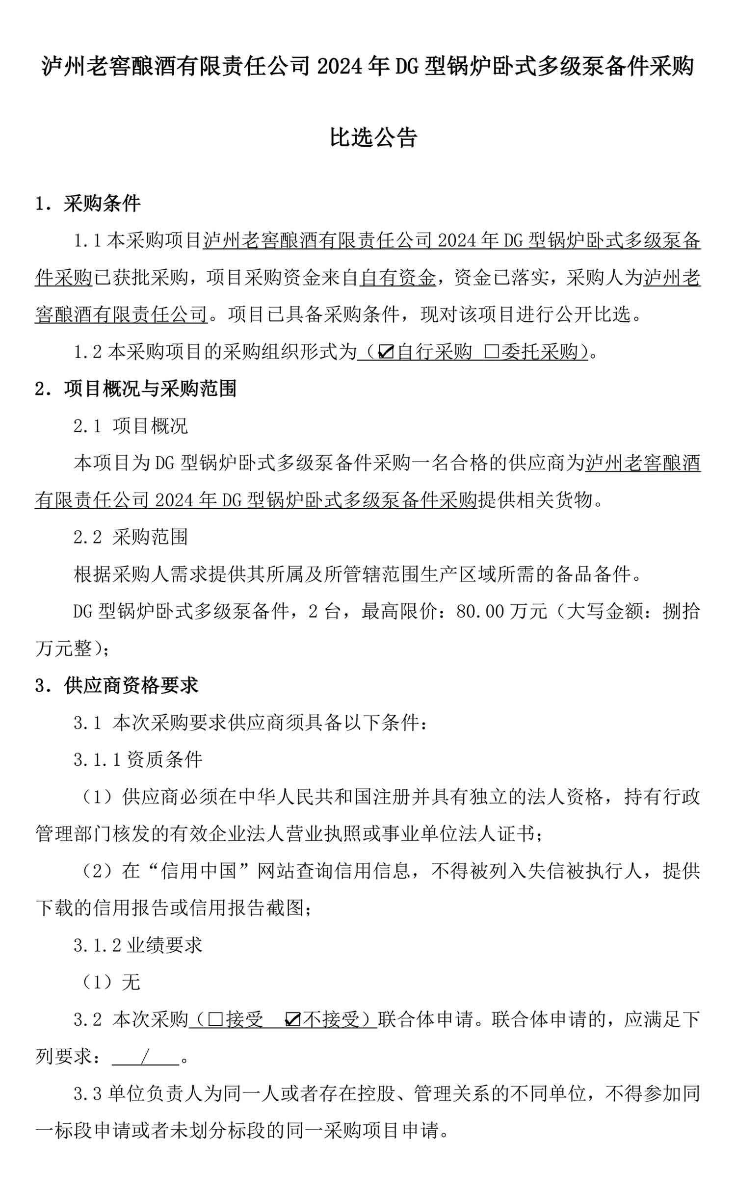 老司机 酿酒有限责任公司2024年DG型锅炉卧式多级泵备件采购比选公告