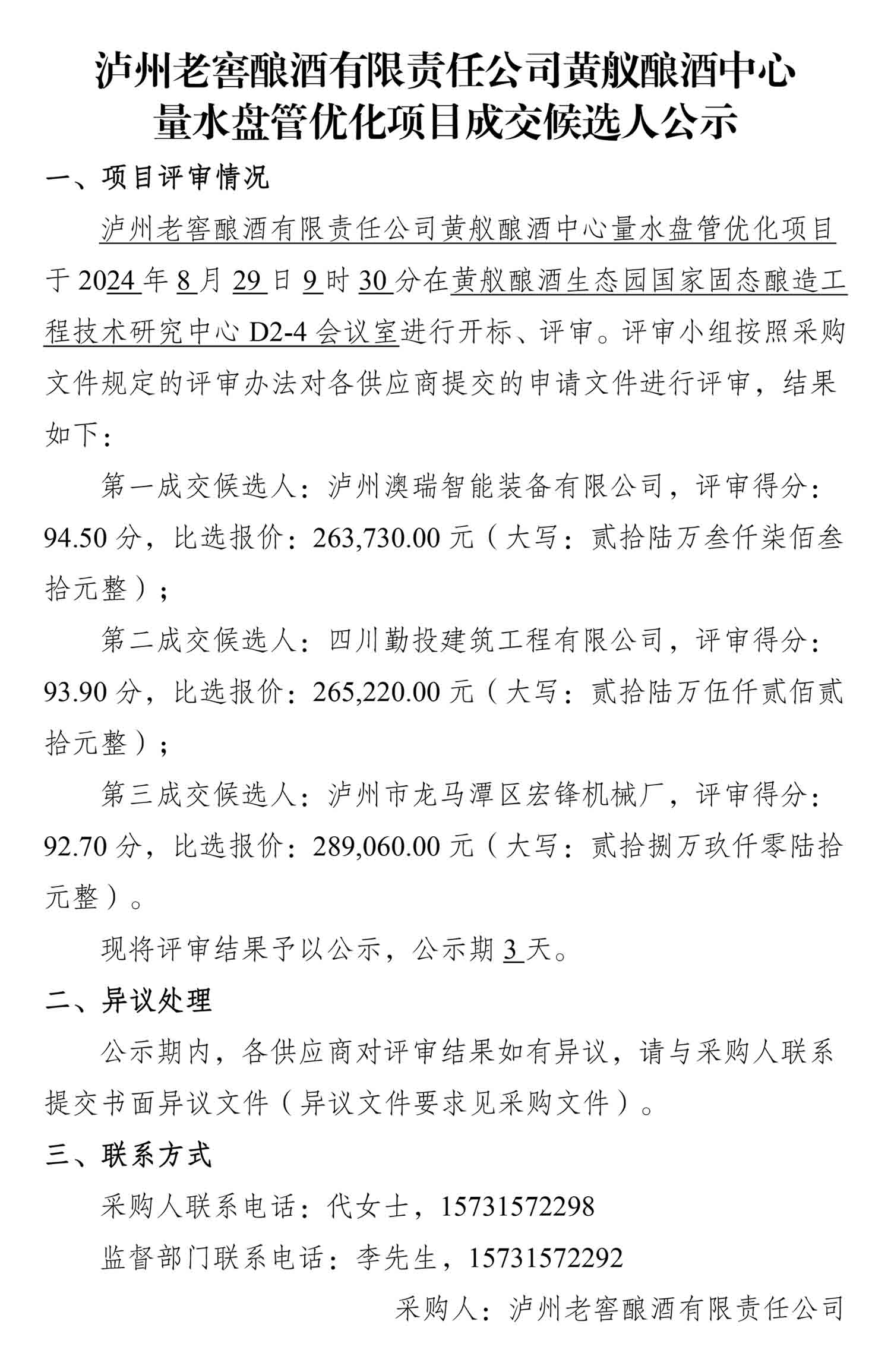 老司机 酿酒有限责任公司黄舣酿酒中心量水盘管优化项目成交候选人公示