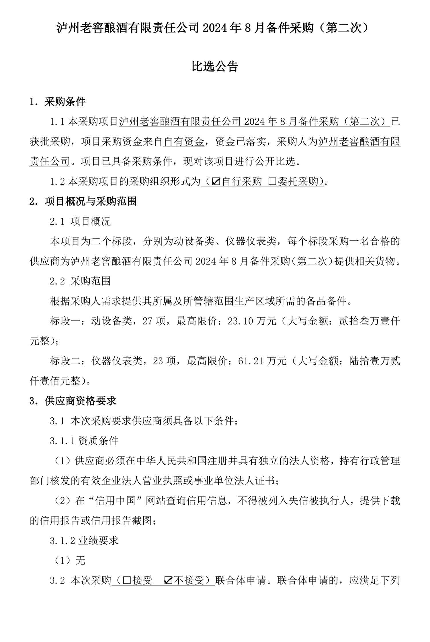 老司机 酿酒有限责任公司2024年8月备件采购(第二次)比选公告