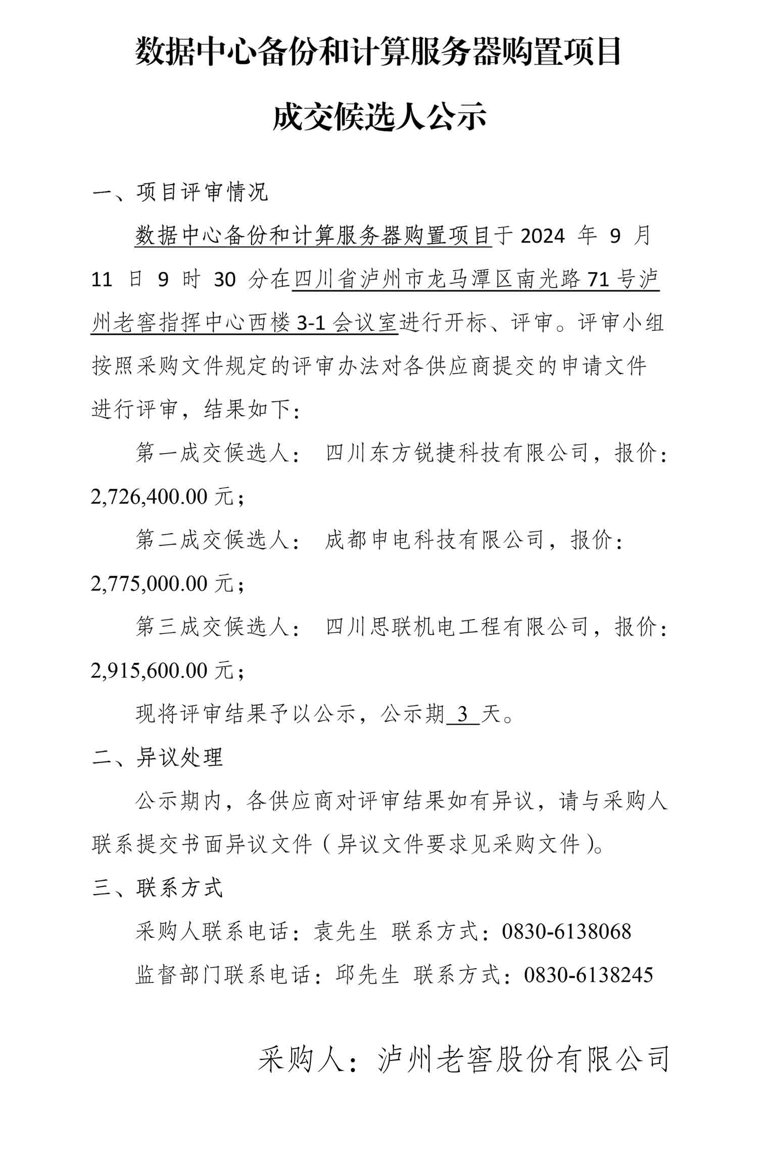 数据中心备份和计算服务器购置项目成交候选人公示