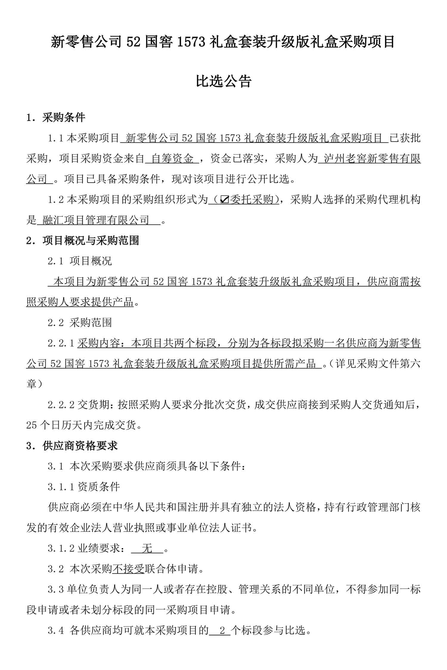 新零售公司52国窖1573礼盒套装升级版礼盒采购项目比选公告