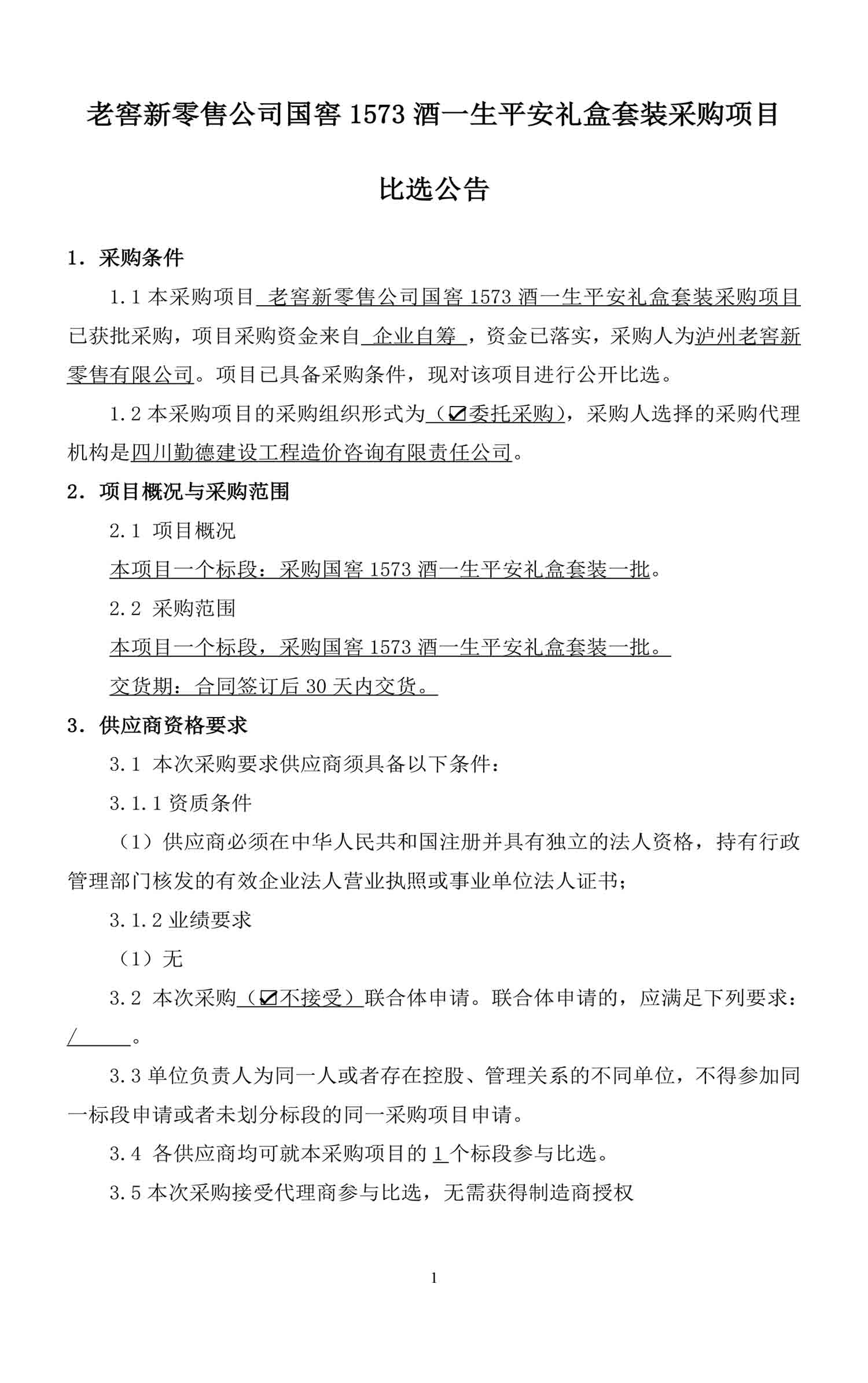 老司机 新零售公司国窖1573酒一生平安礼盒套装采购项目比选公告
