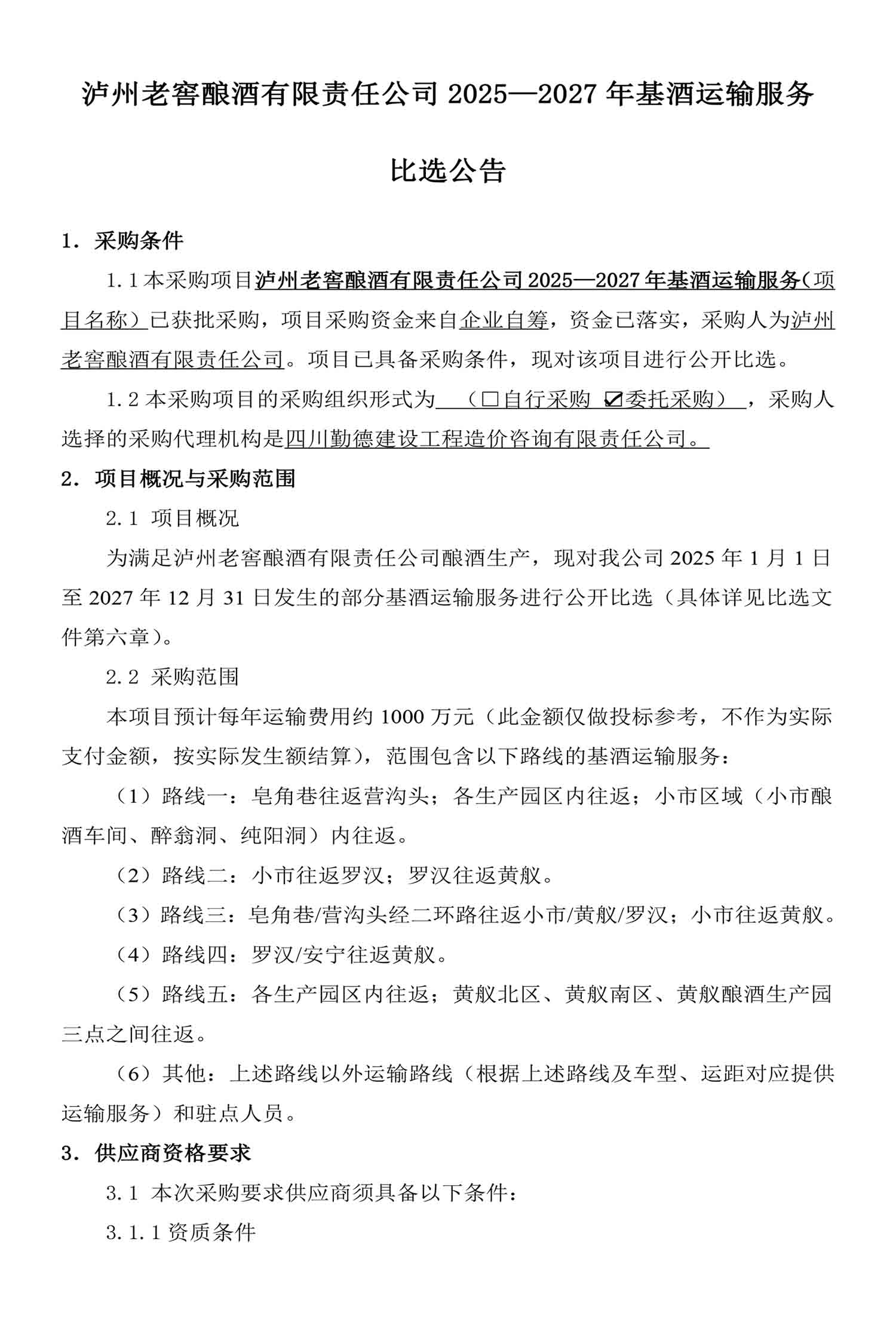 老司机 酿酒有限责任公司2025-2027年基酒运输服务比选公告