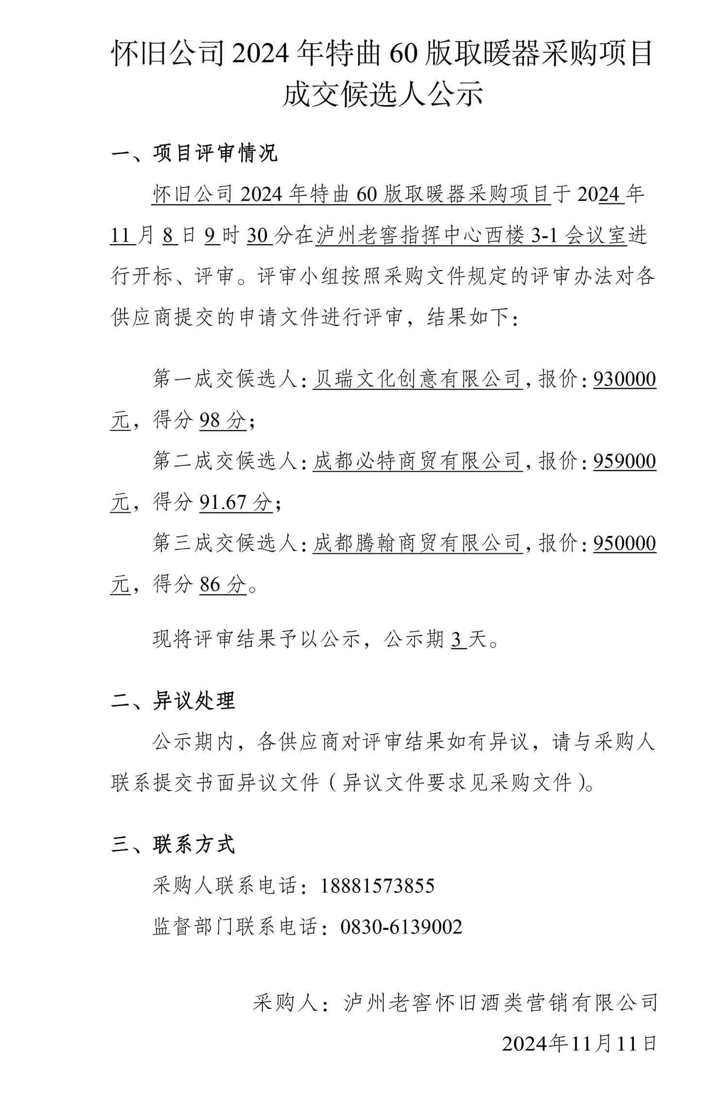 怀旧公司2024年特曲60版取暖器采购项目成交候选人公示