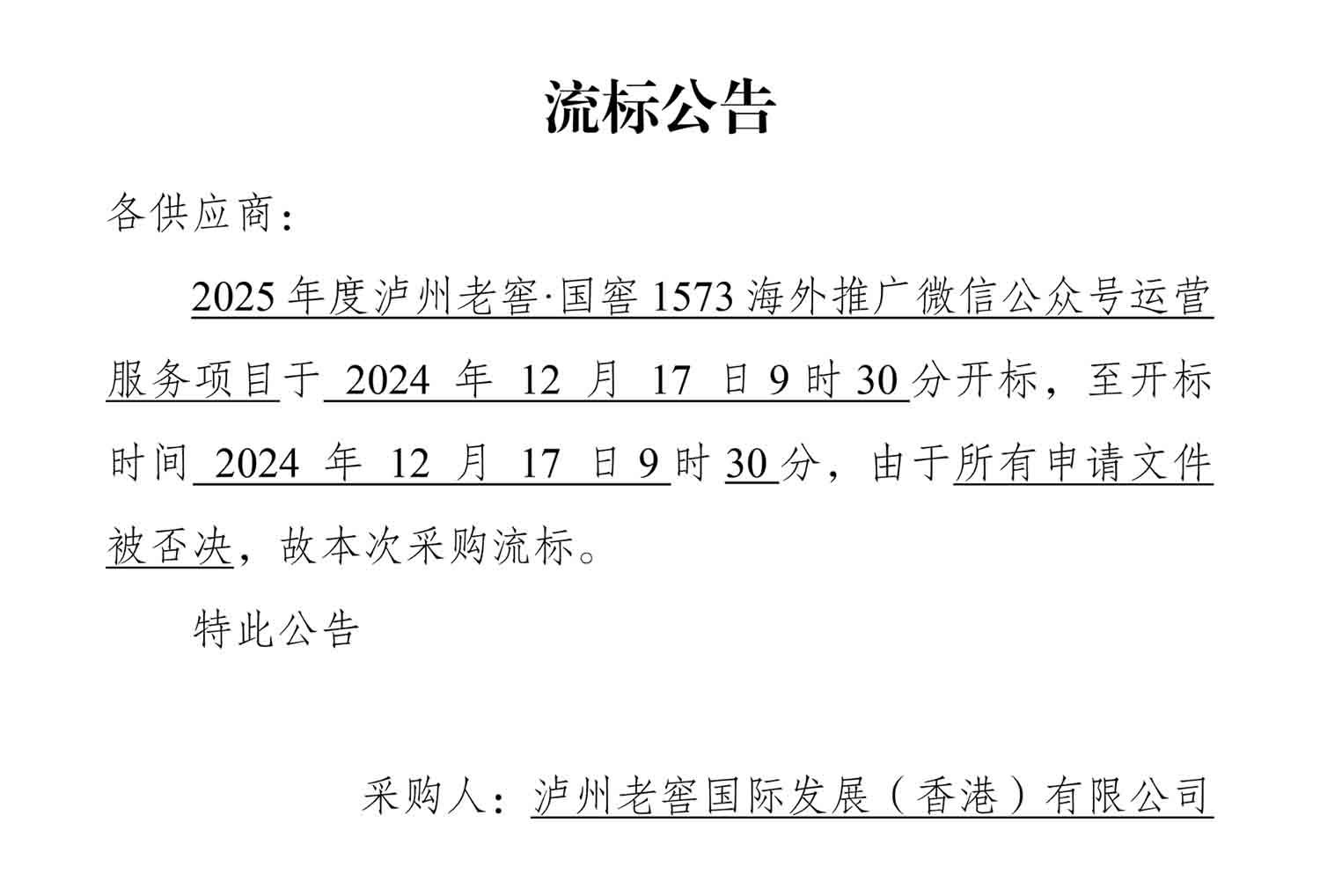 2025年度老司机 ·国窖1573海外推广微信公众号运营服务项目流标公告