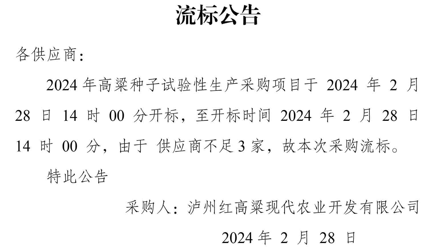 2024年高粱种子试验性生产采购项目流标公告