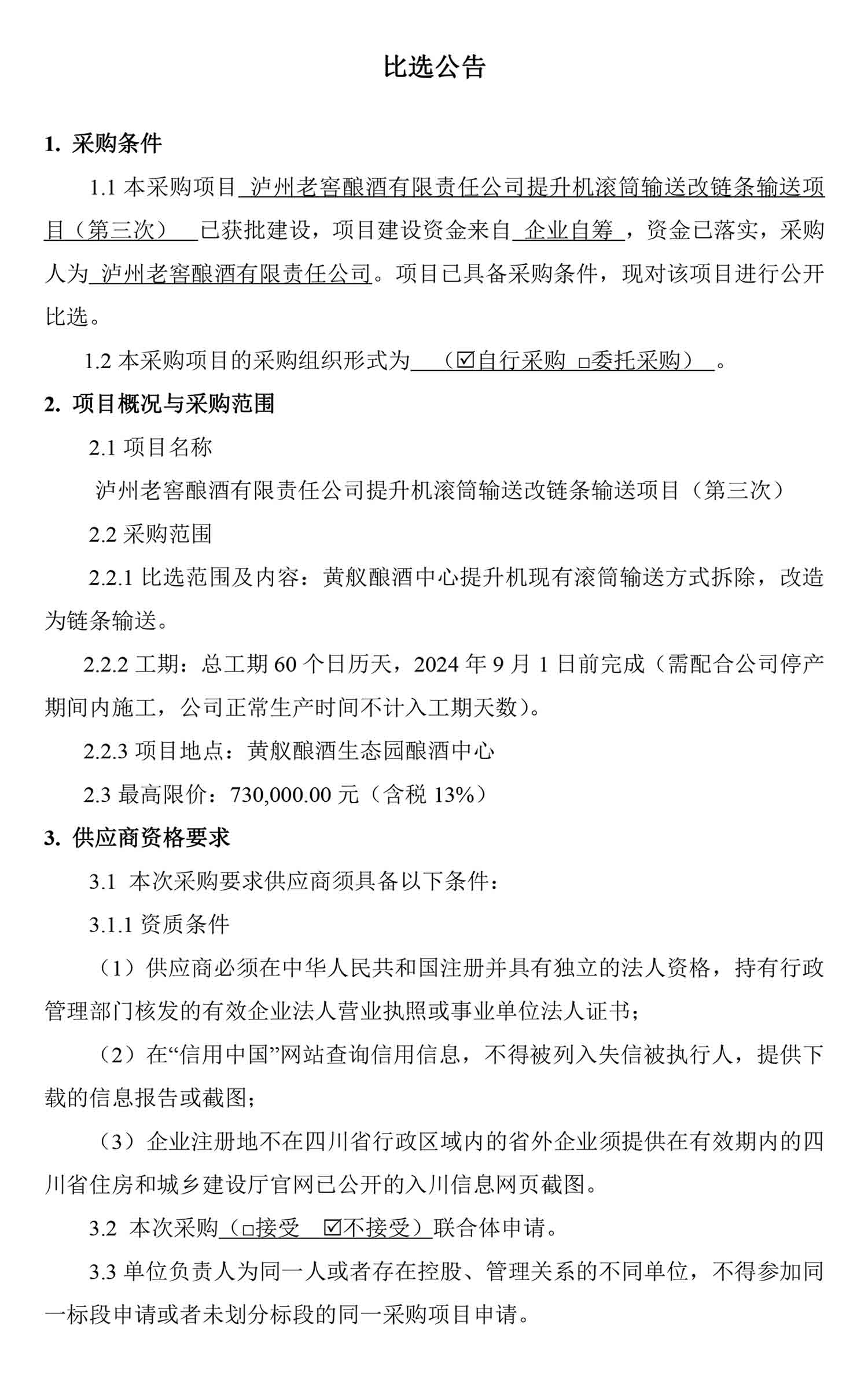 老司机 酿酒有限责任公司提升机滚筒输送改链条输送项目(第三次)比选公告