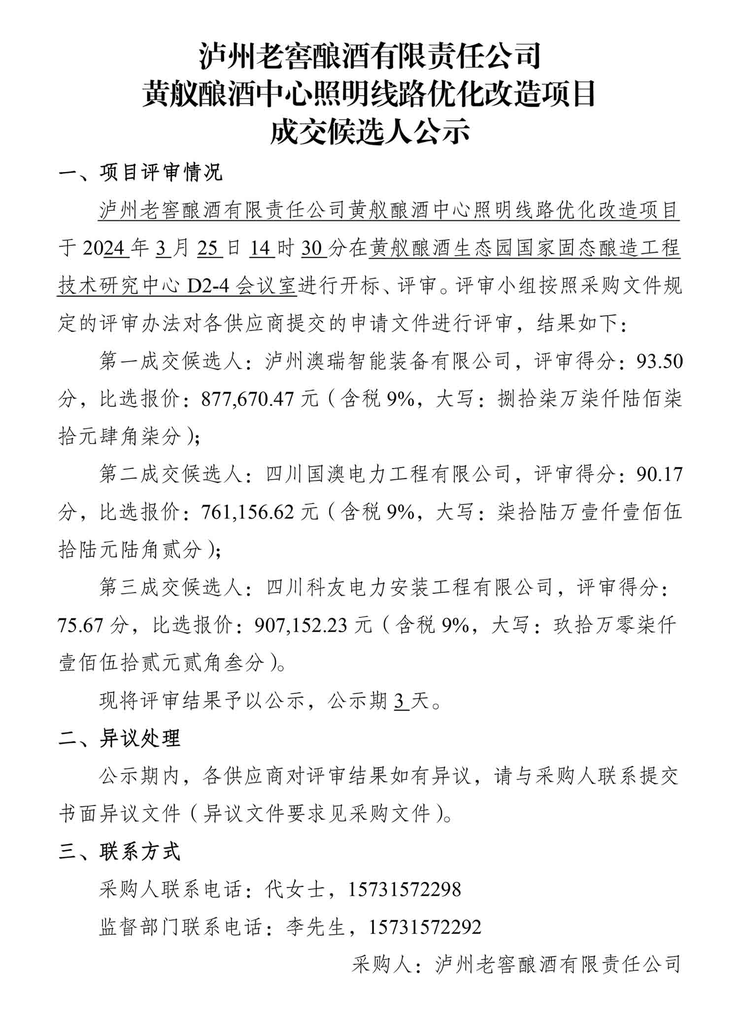 老司机 酿酒有限责任公司黄舣酿酒中心照明线路优化改造项目成交候选人公示