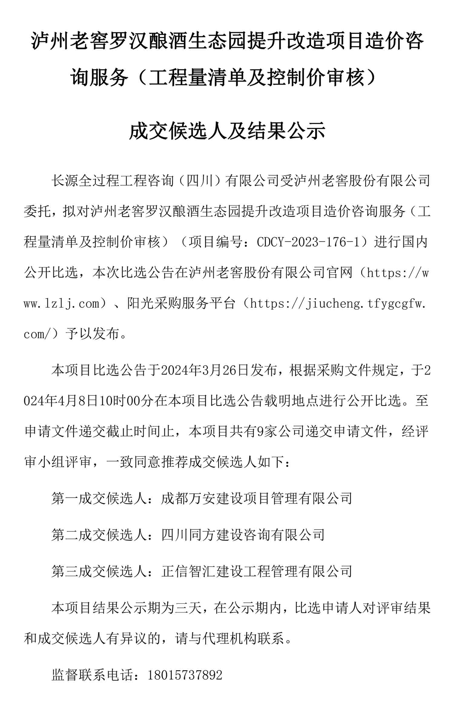 老司机 罗汉酿酒生态园提升改造项目造价咨询服务(工程量清单及控制价审核)成交候选人及结果公示