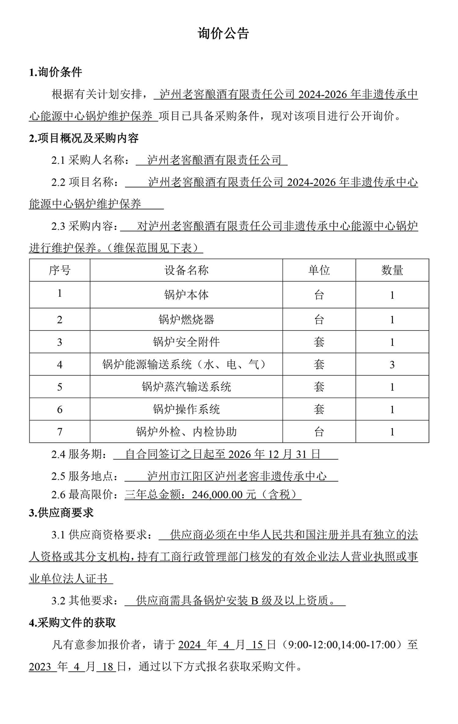 老司机 酿酒有限责任公司2024-2026年非遗传承中心能源中心锅炉维护保养询价公告