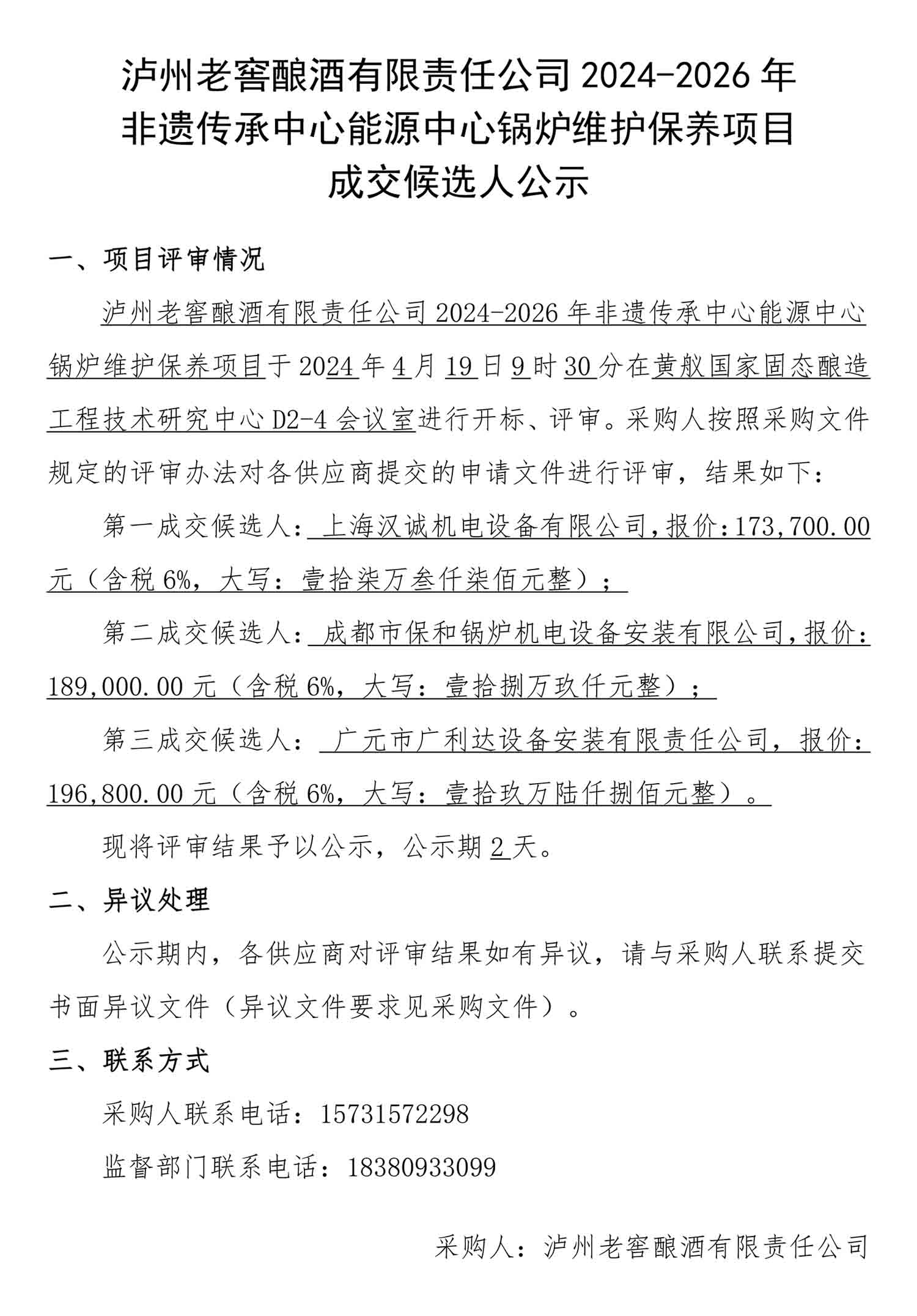 老司机 酿酒有限责任公司2024-2026年非遗传承中心能源中心锅炉维护保成交候选人公示