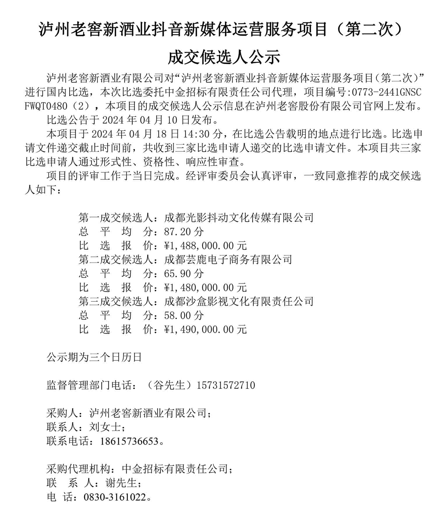 老司机 新酒业抖音新媒体运营服务项目(第二次)成交候选人公示