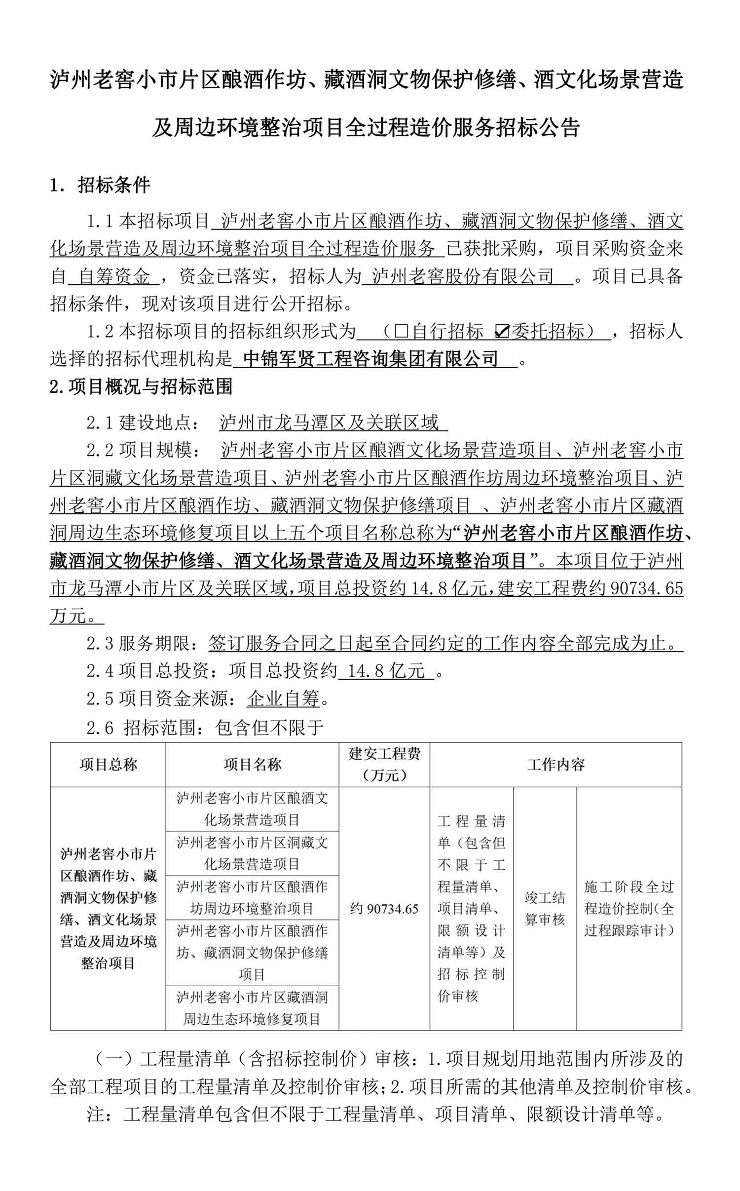 老司机 小市片区酿酒作坊、藏酒洞文物保护修缮、酒文化场景营造及周边环境整治项目全过程造价服务招标公告