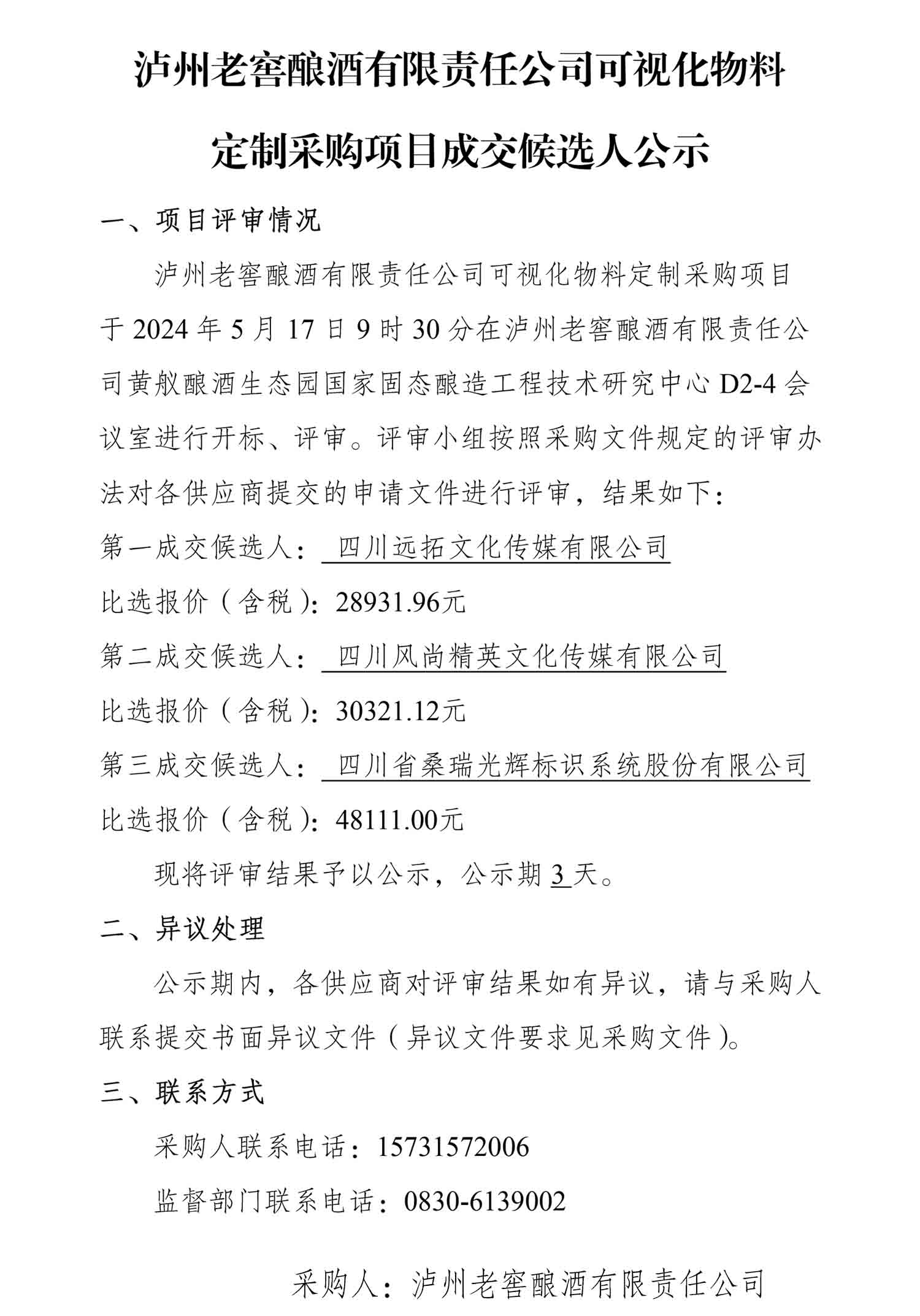 老司机 酿酒有限责任公司可视化物料定制采购项目成交候选人公示