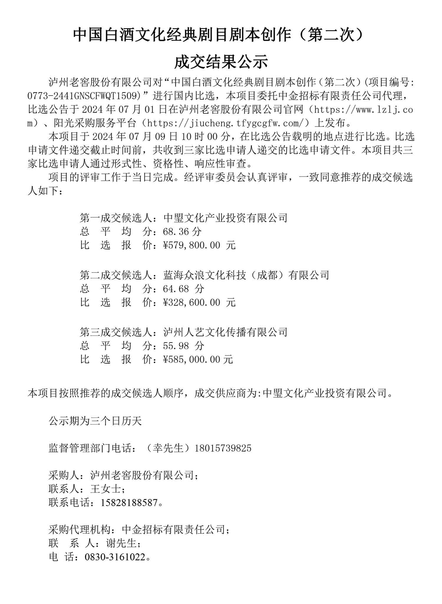 中国白酒文化经典剧目剧本创作(第二次)成交结果公示