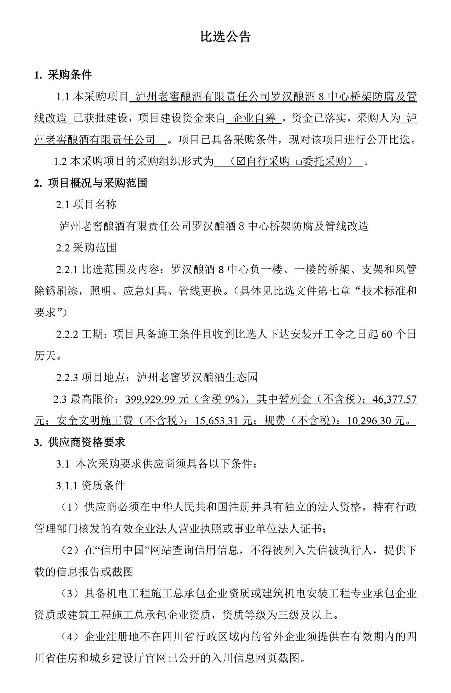 老司机 酿酒有限责任公司罗汉酿酒8中心桥架防腐及管线改造项目比选公告