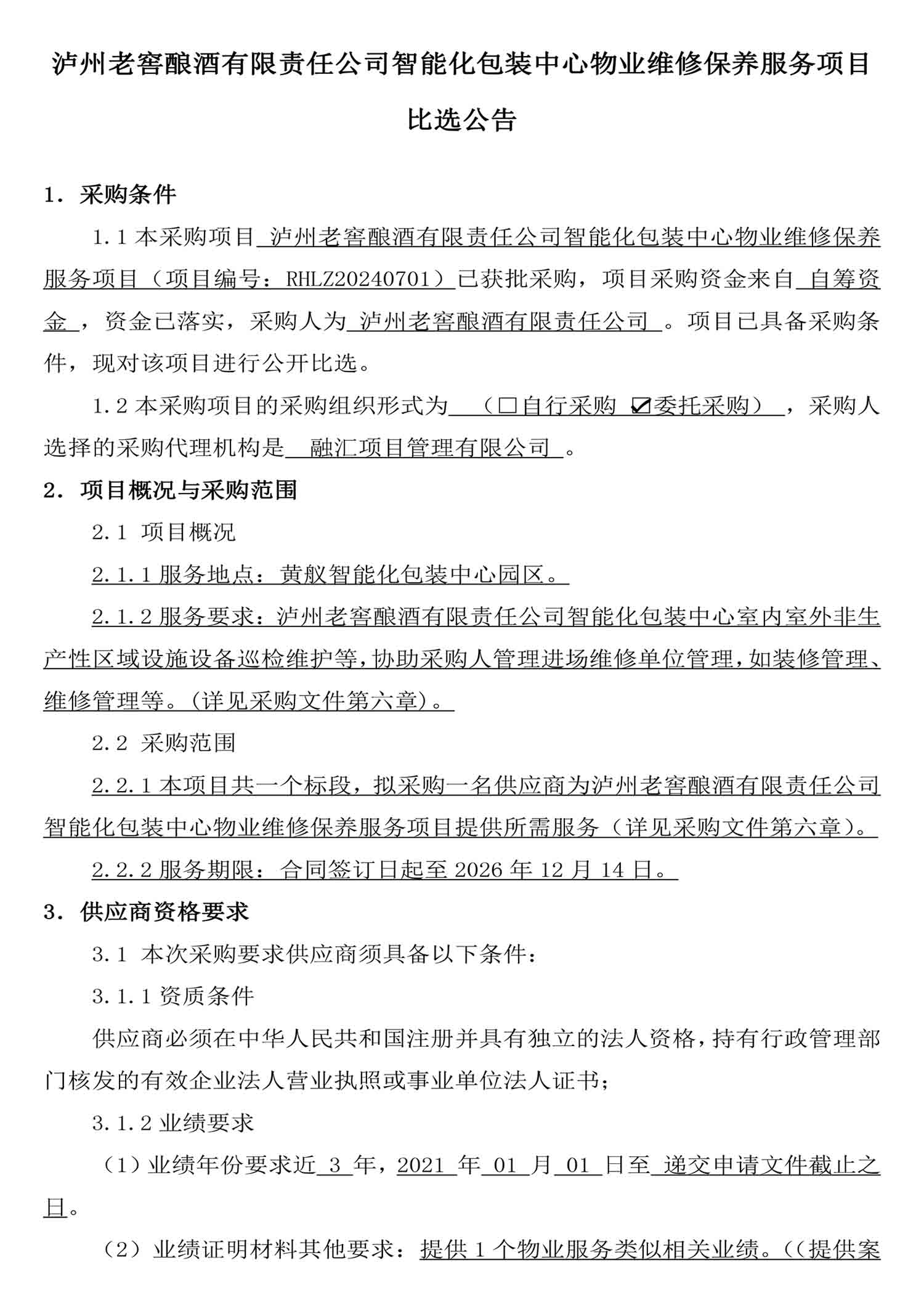 老司机 酿酒有限责任公司智能化包装中心物业维修保养服务项目比选公告